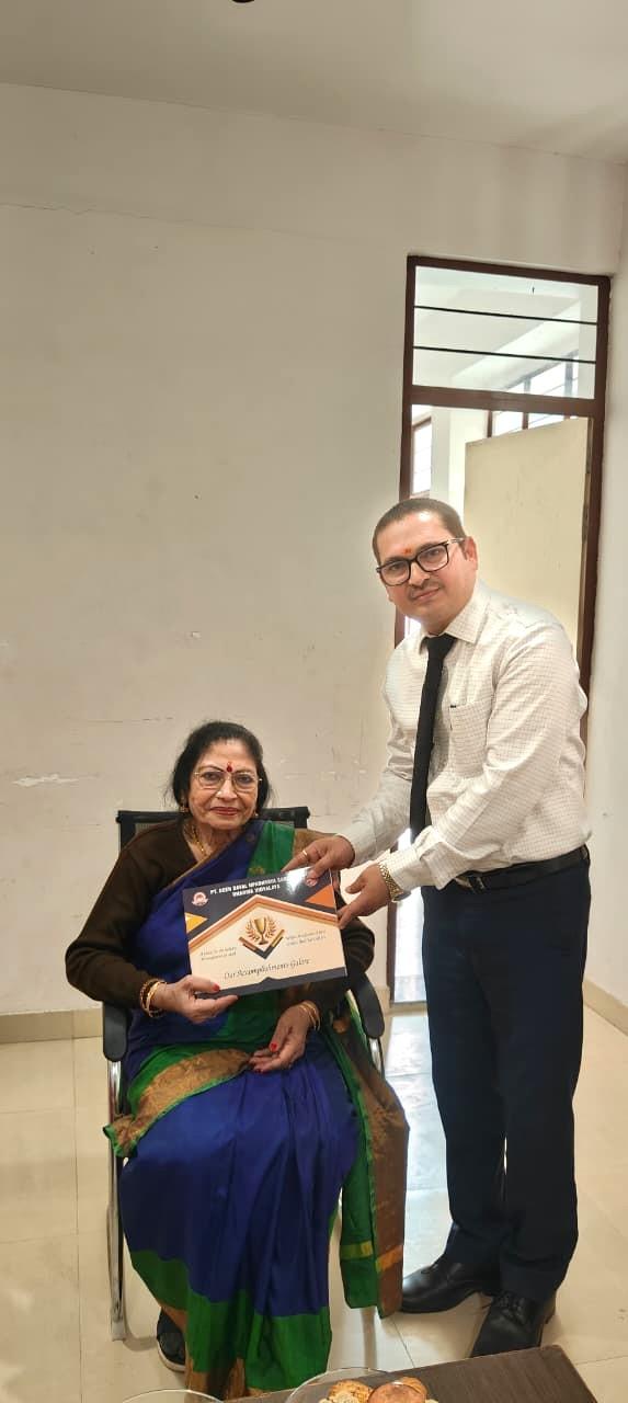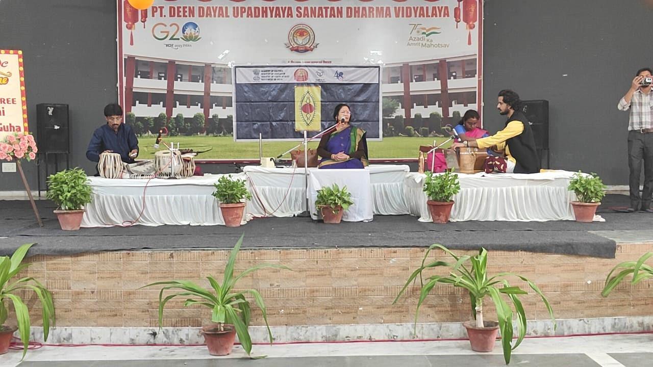 Description: We were privileged to have the renowned Padmashri Sumitra Guha ji, entitled as Vidushi, mesmerize our students with her captivating performance of Classical Vocal Music! Her soulful rendition of Vrindavan Sarang , with her unique pronunciation, deep taans , and intricate bandish , transported us to a spiritual realm! The atmosphere was filled with devotion and melody, as she presented beautiful compositions that showcased her mastery over the genre. She also treated us to soulful classical bhajans on Bhaktimati Mirabai and Shri Krishna, leaving the audience spellbound!